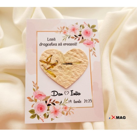 Hartia plantabila este realizata manual, din hartie reciclata si contine semnite de flori si petale. Semintele si petalele pot sa difere in functie de stocul disponibil.