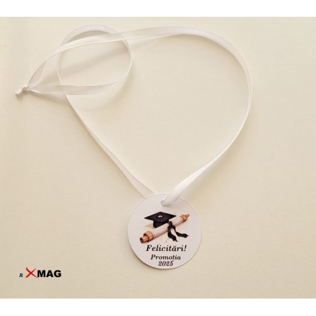 Medalia este realizata din carton de 300g, si este legata cu panglica satinata alba.