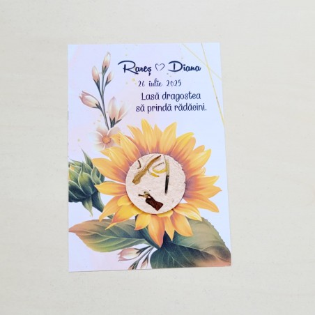 Fiecare mărturie este compusă dintr-un cartonaș personalizat și un disc de hârtie plantabilă, presărat cu semințe. Se plantează în pământ, se udă și... răsare o floare – exact ca dragostea voastră.